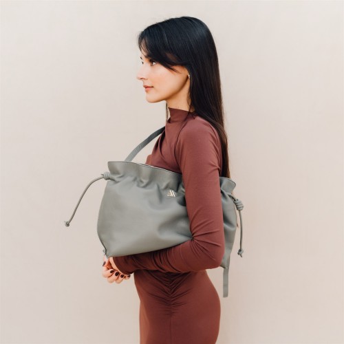 Sac à main froncé en cuir nappa de hute qualité de couleur gris.