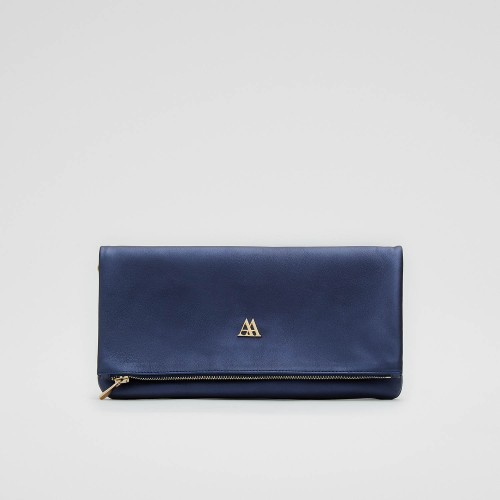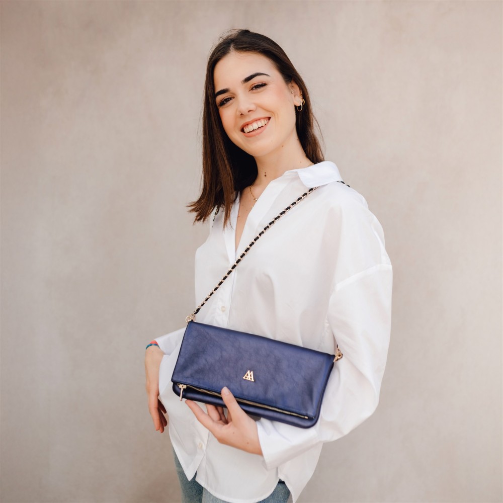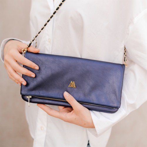 Sac à main, à bandoulière et à épaule en cuir laminé de couleur bleu marine métallisé.