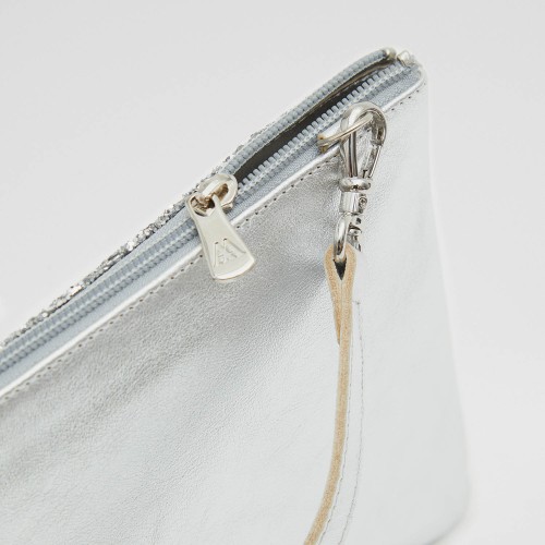 Pochette en tissu pailleté et cuir. Deux combinaisons possibles, poignée longue et courte.