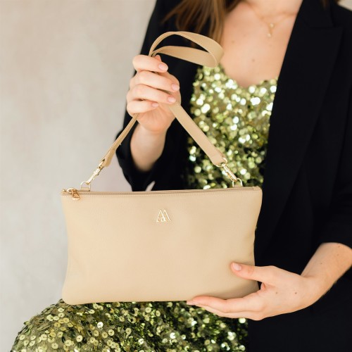 Pochette en cuir de haute qualité de couleur beige et de finition rugueuse.
